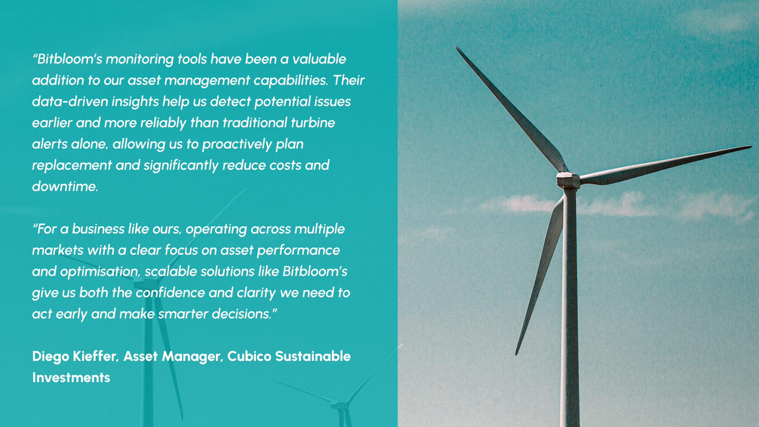 Cubico Sustainable Investments (Cubico) is one of the world’s largest privately-owned renewable energy companies, with a portfolio of over 3.4 GW across nine countries. Bitbloom has worked with Cubico on its global wind portfolio for several years to help monitor and optimise operations, and has identified opportunities to drive value and create significant cost savings.